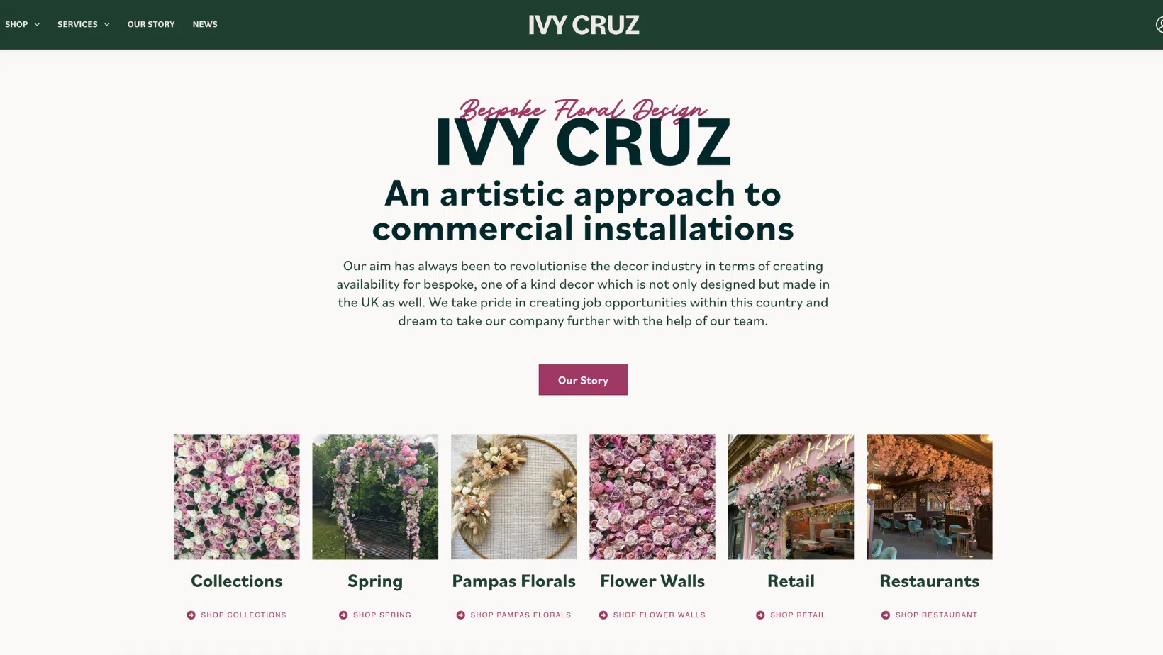 Ivy Cruz create stunning floral design installations globally, with many featured in UK Restaurants, Cafes, Bars and more. Ivy Cruz also has an eCommerce arm selling Etsy prior to the website launch and having a strong Social following with over 1 Million in social views.